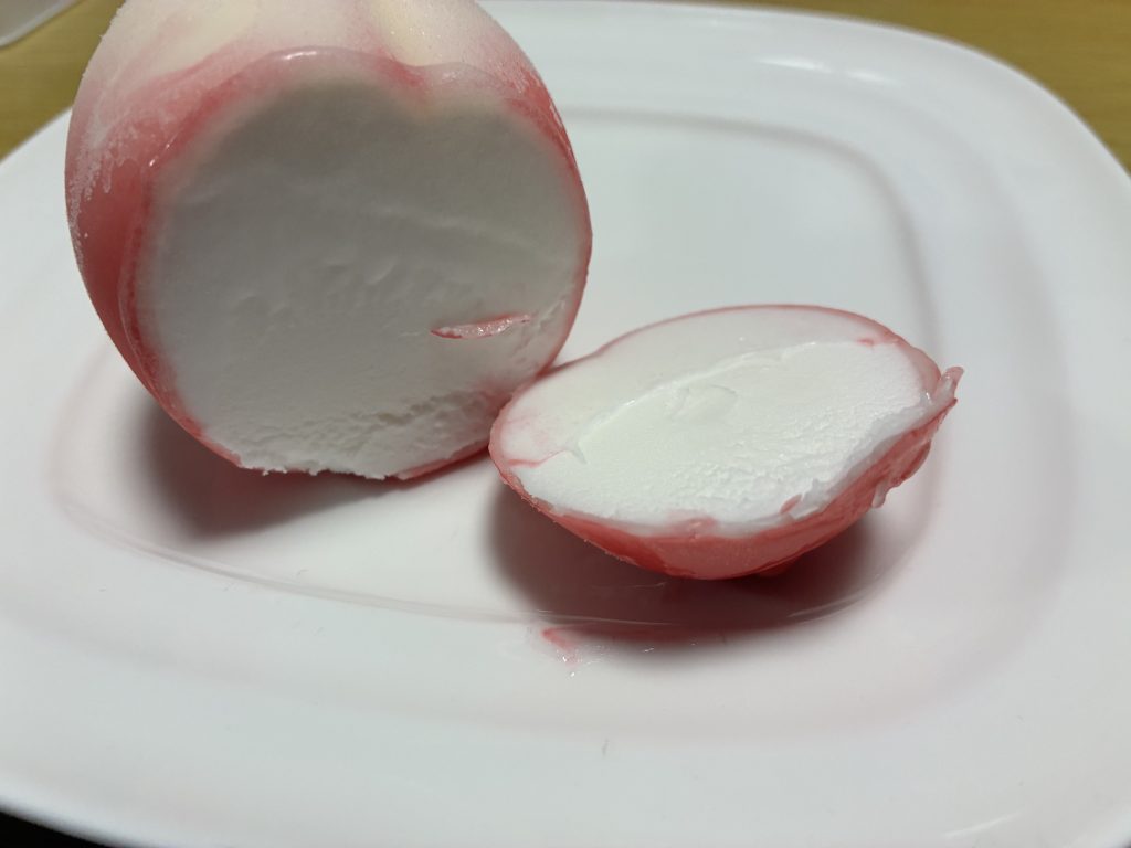 ひと口かじると、まず外側の“果皮風コーティング”の冷たさと、うっすら甘さが口に広がります。桃の香りと甘みがしっかり感じられ、「果物を食べているような」ジューシー感がある。実際、原料に桃の濃縮果汁が使われていて、その果汁感・桃らしさはよく再現されています。