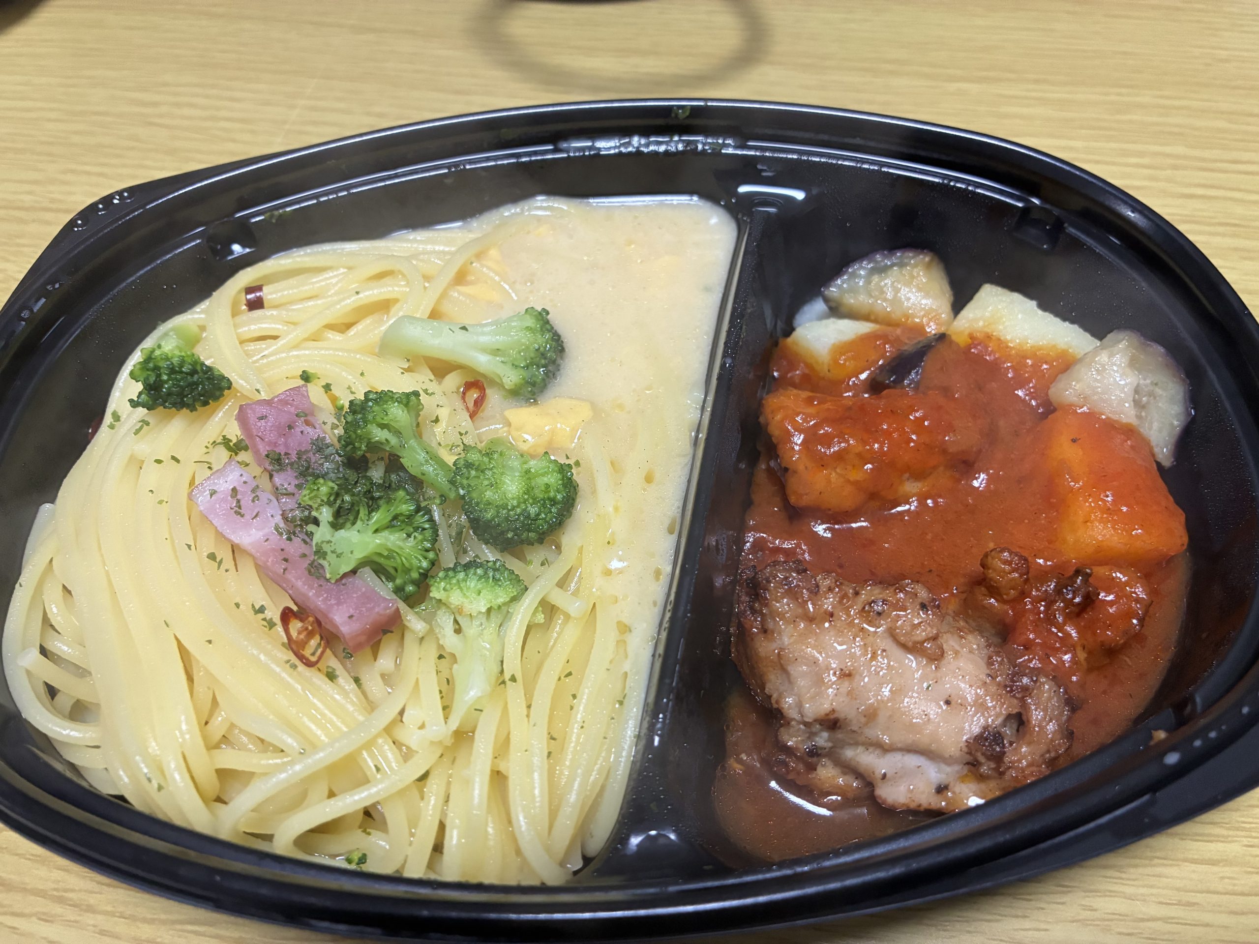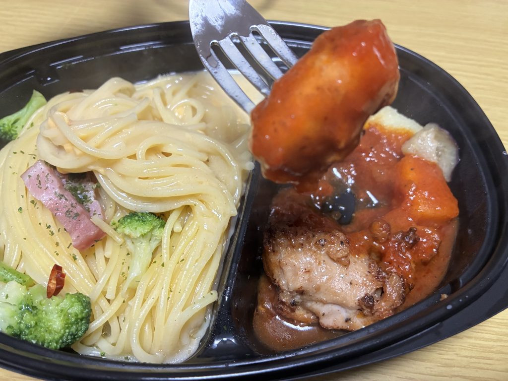 トマトソースのチキンがしっとりしていておいしいです。備え付けの野菜(ポテトと茄子)が噛む必要がないほどや柔らかくなっています。