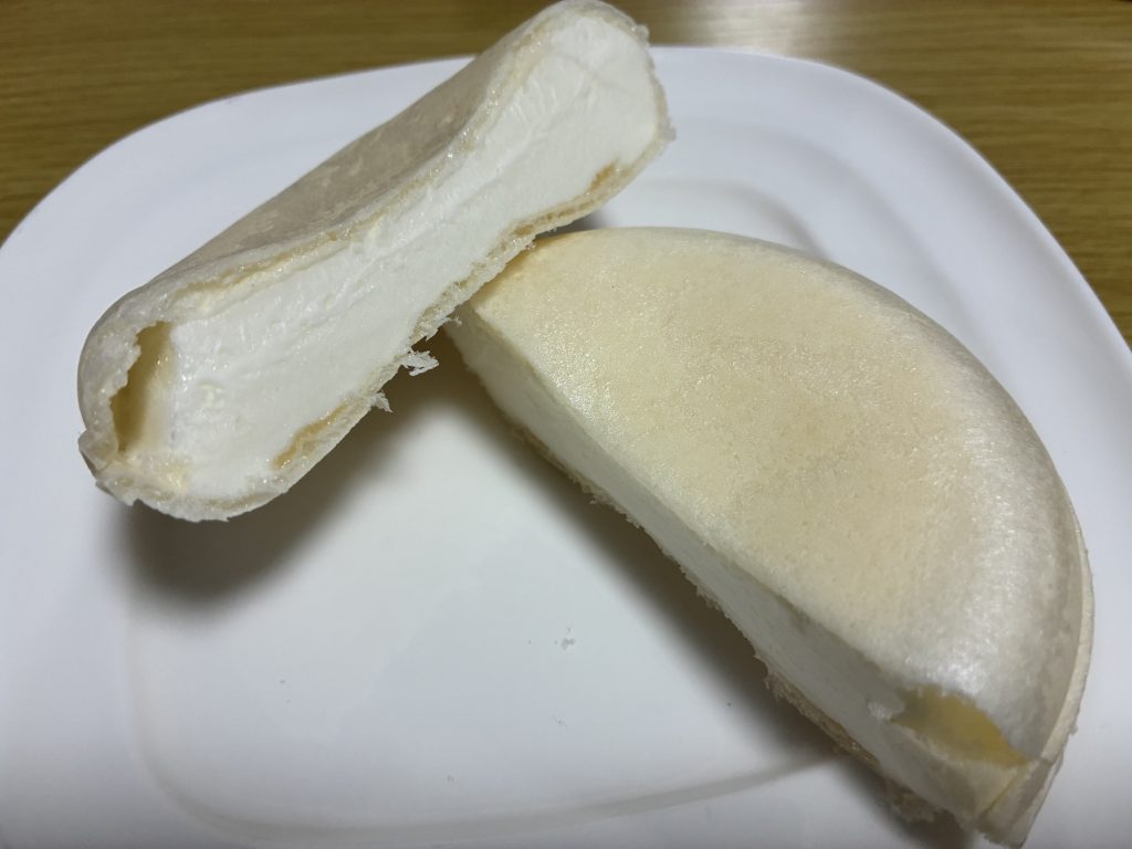 半分に切ってみるとアイスがぎっしり入っていて、ミルキーの練乳ソースがうすく膜みたいになっています。