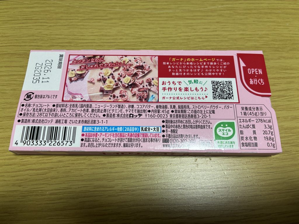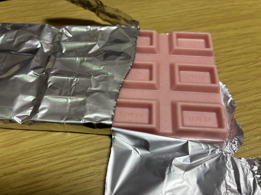 このチョコのすごいところは、ただ甘いだけじゃなくて「甘酸っぱさ」がちゃんとしていること。 ガーナ特有のなめらかなホワイトチョコをベースに、いちごパウダーが練り込まれているので、後味がすっきりしています。