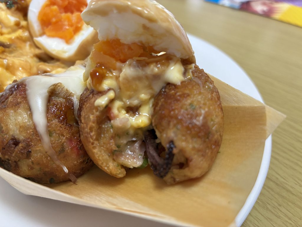 たこ焼きのスリーブから出すと、まずたこ焼きの丸いフォルムではあるものの、上にのったゆで卵が「存在感」を放っていて、パッと見ただけで「コラボならでは」の特別感があります。