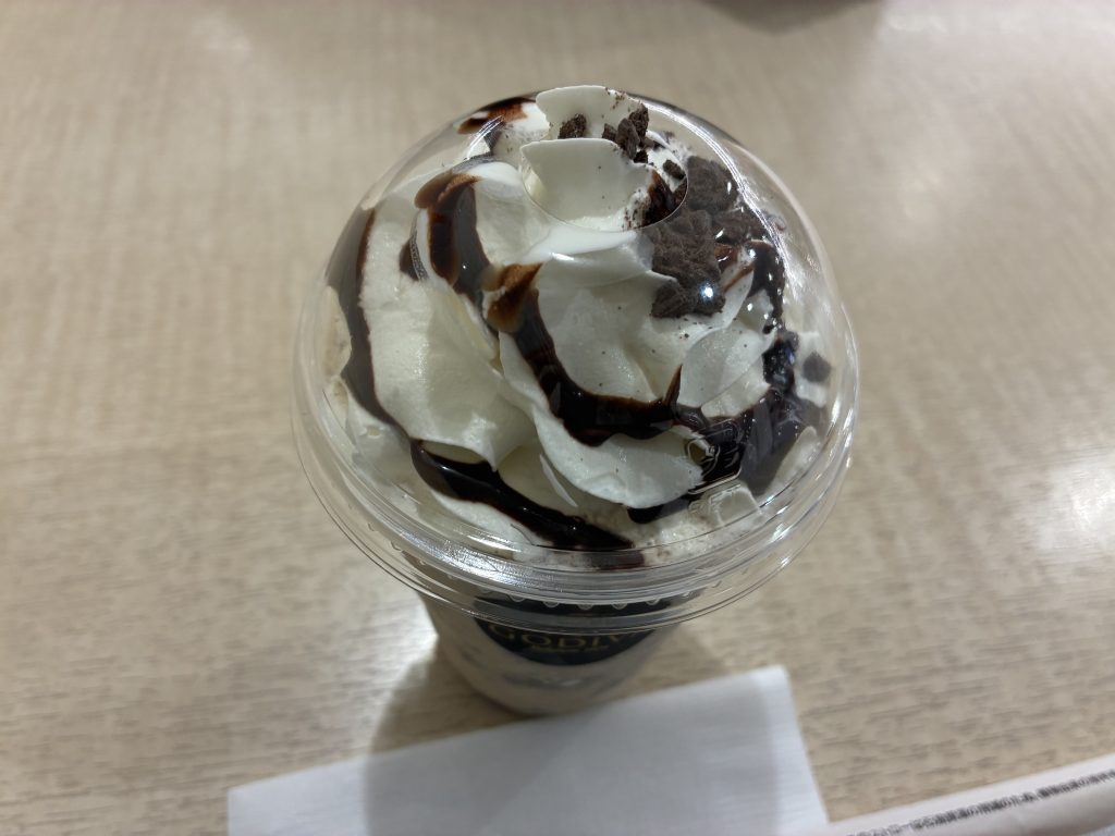 一口飲むと、最初に ミルクチョコレートの濃厚でまろやかな甘さとコク が広がります。そこに 砕いたココアクッキーの香ばしさとザクザクとした食感があり、ドリンクなのに若干の“食べ応え”を感じさせてくれるのがおもしろったです。ホイップクリームやチョコソースの滑らかさもあって、まるで ゴディバのチョコレートを食べているような味わいでした。濃厚で甘く、だけどクッキーの苦みとチョコの深みが後味を引き締めてくれます。