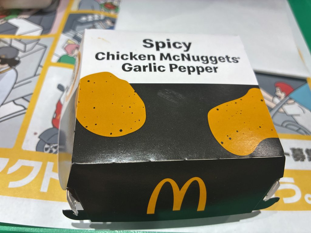 衣はサクッと軽く、中のチキンはいつものナゲットらしくしっとりジューシー。噛むたびにガーリックのコクと黒胡椒のスパイシーさが広がり、後味は意外とキレがよく、重たさは感じません。辛さは強すぎず、ピリ辛レベルなので、辛いものが極端に苦手でなければ十分楽しめるバランスだと思います。