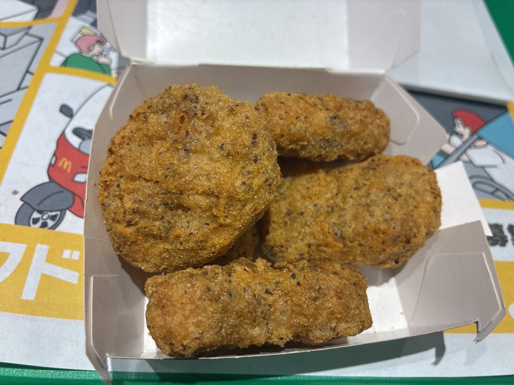 全体として、定番のチキンマックナゲットにスパイス感とパンチを加えた、食べ応えのある一品。おやつというよりは、小腹満たしやおつまみ感覚で楽しみたくなる味わいでした。ガーリック系や黒胡椒が好きな方には、ぜひ一度試してほしいナゲットです。