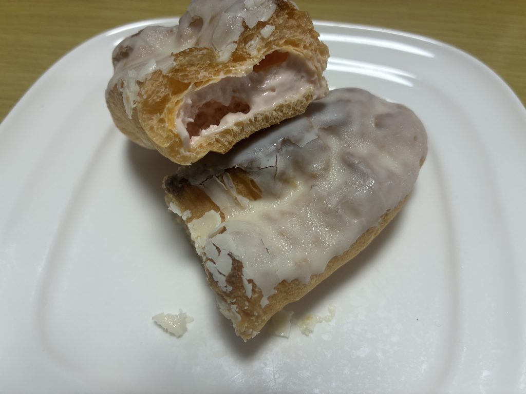 香ばしいシュー生地と甘みのあるホワイトチョココーティングが加わることで、味がぼやけず、全体が引き締まった印象に仕上がっています。れん乳ソース自体はほとんど感じられませんでしたが、いちごミルク風味のエクレアとして見ると、バランスの取れた、なかなか満足感のある一品でした。