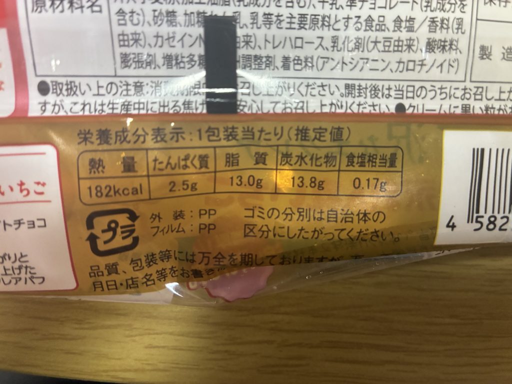 上のコーティングはホワイトチョコレートで、シュー生地は香ばしく、噛むとクシュっとした食感があります。中にはれん乳いちごクリームが入っており、ふんわりと軽い口当たり。れん乳感はいちご風味ともに控えめで、全体的にやさしい味わいです。