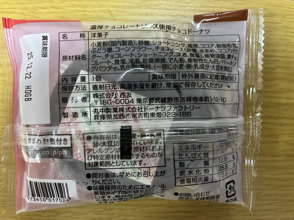 ミルクドーナツ同様に大きさもちょうどよく、1つで満足できるサイズ感です。生地のしっとり感とチョコレートの濃厚さのバランスが絶妙で、コンビニドーナツと比べても遜色ない、むしろそれ以上のクオリティだと感じました。